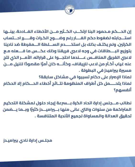 وأبدى مجلس بيراميدز دهشته من تعيين البنا وعاشور متسائلًا عبر البيان: "لماذا الإصرار على حكام تسببوا بمشكلات سابقة؟ ولماذا يتحمل كل أطراف المنظومة نتائج أخطاء الحكام إلا الحكام أنفسهم؟".