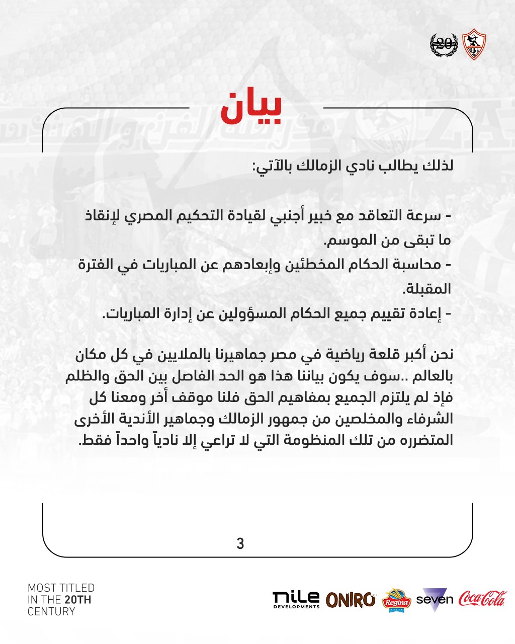 ونوه الزمالك في بيانه بأن الأخطاء التحكيمية التي شهدتها مباريات الدوري رأت عدة أندية أنها متعمدة لصالح نادي واحد، مؤكدًا أن ذلك يقتل المنافسة العادلة بين جميع الأندية المشاركة في المسابقة، وبالطبع يقلل من قيمة المسابقة الأكبر والأقدم في المنطقة.