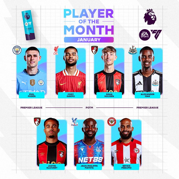ونشرت الصفحة الرسمية لرابطة الدوري الإنجليزي عبر منصة "إكس" اللاعبين المرشحين للفوز بجائزة أفضل لاعب في شهر يناير.
