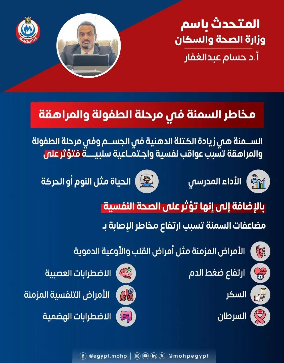 كشفت وزارة الصحة والسكان عن مخاطر السمنة فى مرحلة الطفولة والمراهقة، وقالت وزارة الصحة والسكان، إن السمنة هى زيادة الكتلة الدهنية فى الجسم وفى مرحلة الطفولة والمراهقة تسبب عواقب نفسية واجتماعية سلبية، فتؤثر على الأداء المدرسى والحياة مثل النوم أو الحركة.