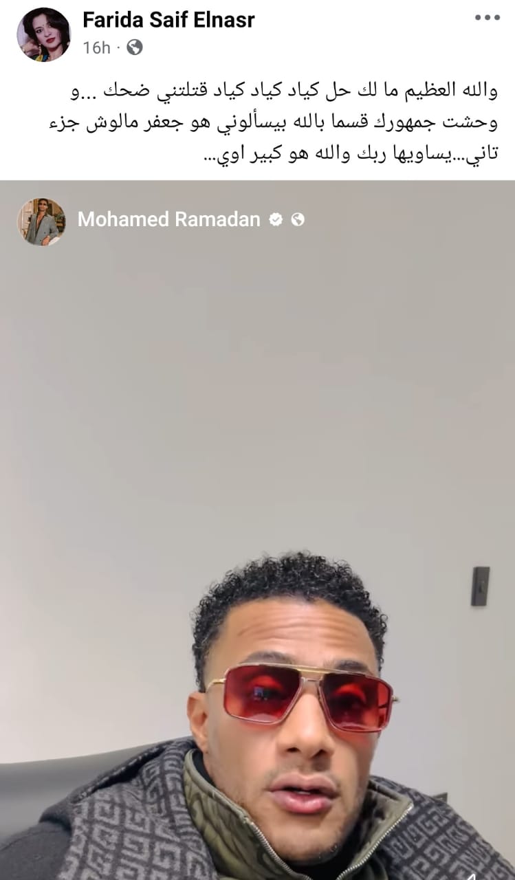 وقالت فريدة رسالة له عبر حسابها الرسمي على موقع التواصل الاجتماعي "فيسبوك": "والله العظيم مالك حل، كياد كياد كياد، قتلتني ضحك... ووحشت جمهورك، قسمًا بالله بيسألوني هو جعفر مالوش جزء تاني؟ يسّاويها ربك والله، هو كبير أوي".