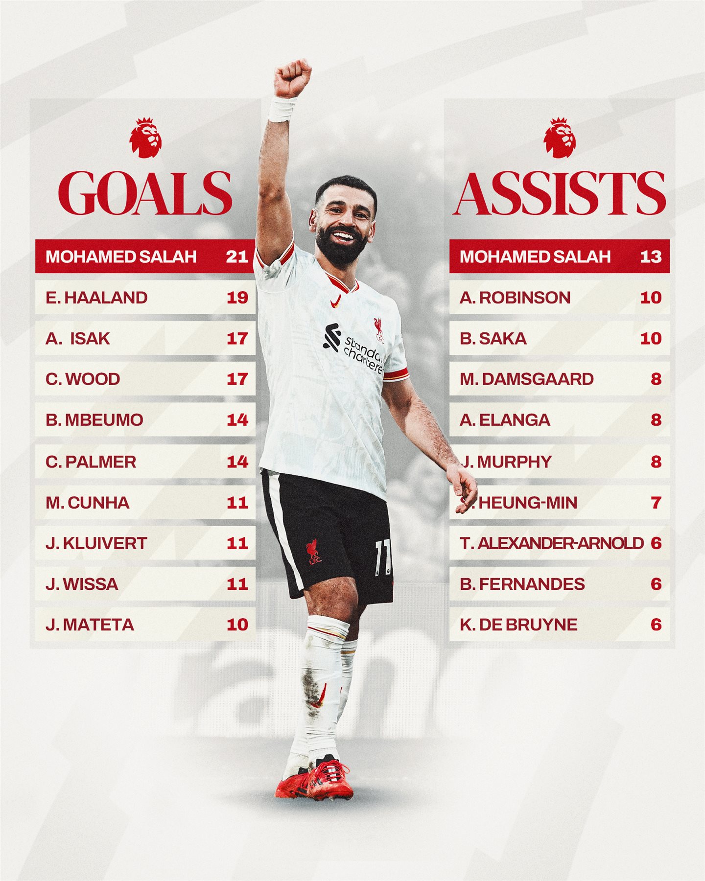 وكتب الحساب الرسمي لنادي ليفربول عبر منصة "إكس": "صلاح يواصل صدارة الترتيب في الدوري الإنجليزي الممتاز" في إشارة لترتيب الهدافين وملوك الأسيست.