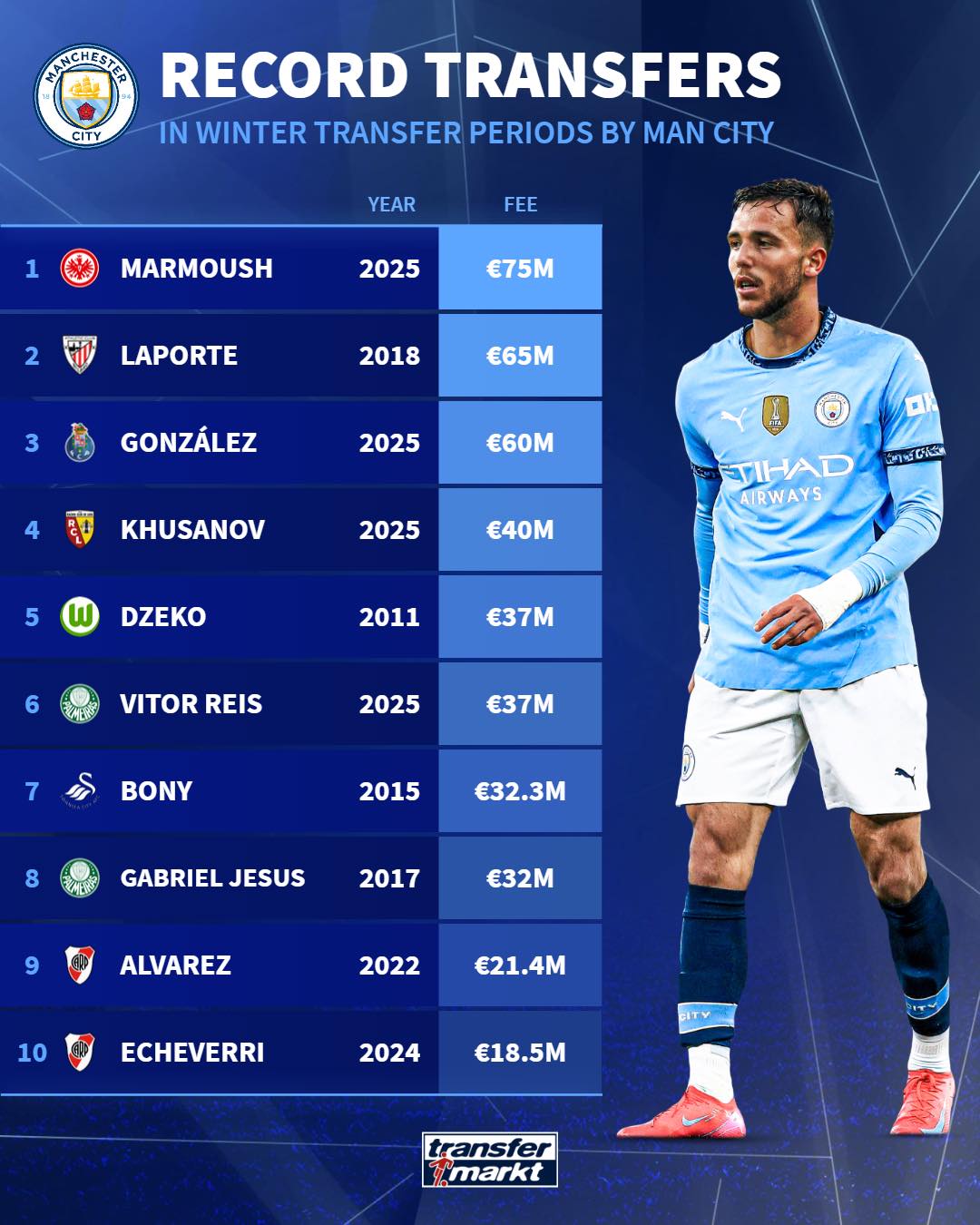 وحل الإسباني نيكو جونزاليس في المرتبة الثالثة بقائمة أغلى صفقات مانشستر سيتي على مدار التاريخ، والتي أتممها النادي الإنجليزي في فترة الانتقالات الشتوية.