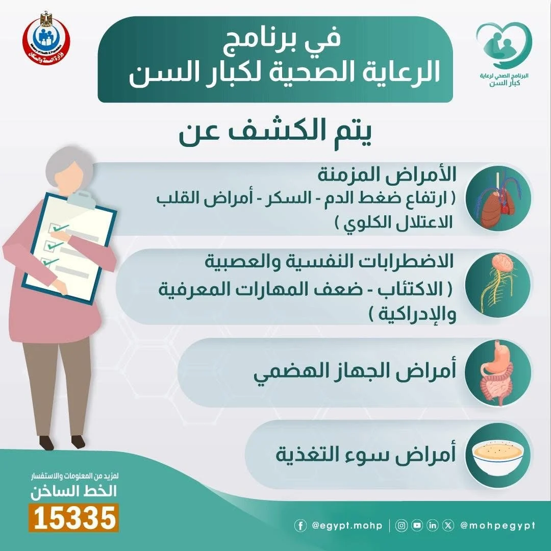 كشفت وزارة الصحة والسكان عن الفحوصات الطبية المقدمة في برنامج الرعاية الصحية لكبار السن.