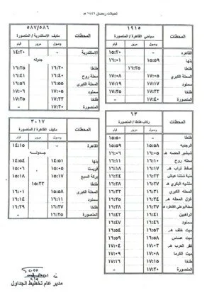- - قيام قطار ۱۹۱۵ سياحى (القاهرة / المنصورة) من القاهرة الساعة ٢٠: ١٥ يصل المنصورة الساعة ١٧:٤٠ كالجدول المرفق.
