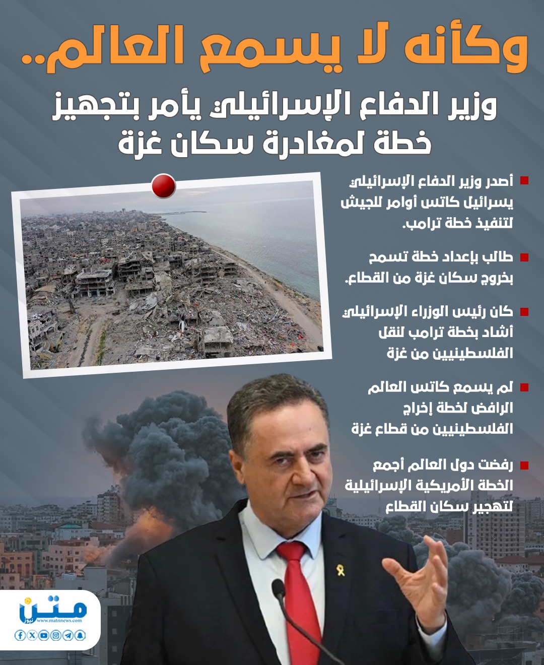 - لم يسمع كاتس العالم الرافض لخطة إخراج الفلسطينيين من قطاع غزة
