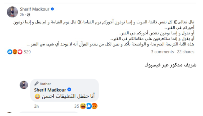 الإعلامي المصري شريف مدكور.. أثار الإعلامي المصري شريف مدكور جدلًا واسعًا بعد منشور استشهد فيه بآية قرآنية للقول إن "الحساب يتم يوم القيامة وليس في القبر".