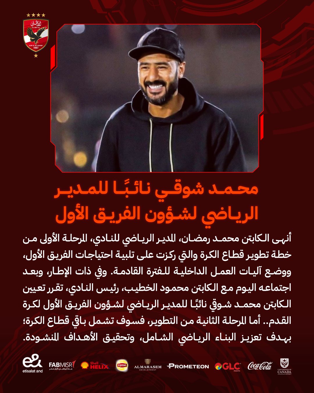 وأضاف البيان: "في ذات الإطار، وبعد اجتماعه اليوم مع محمود الخطيب رئيس النادي، تقرر تعيين محمد شوقي نائبا للمدير الرياضي لشؤون الفريق الأول".