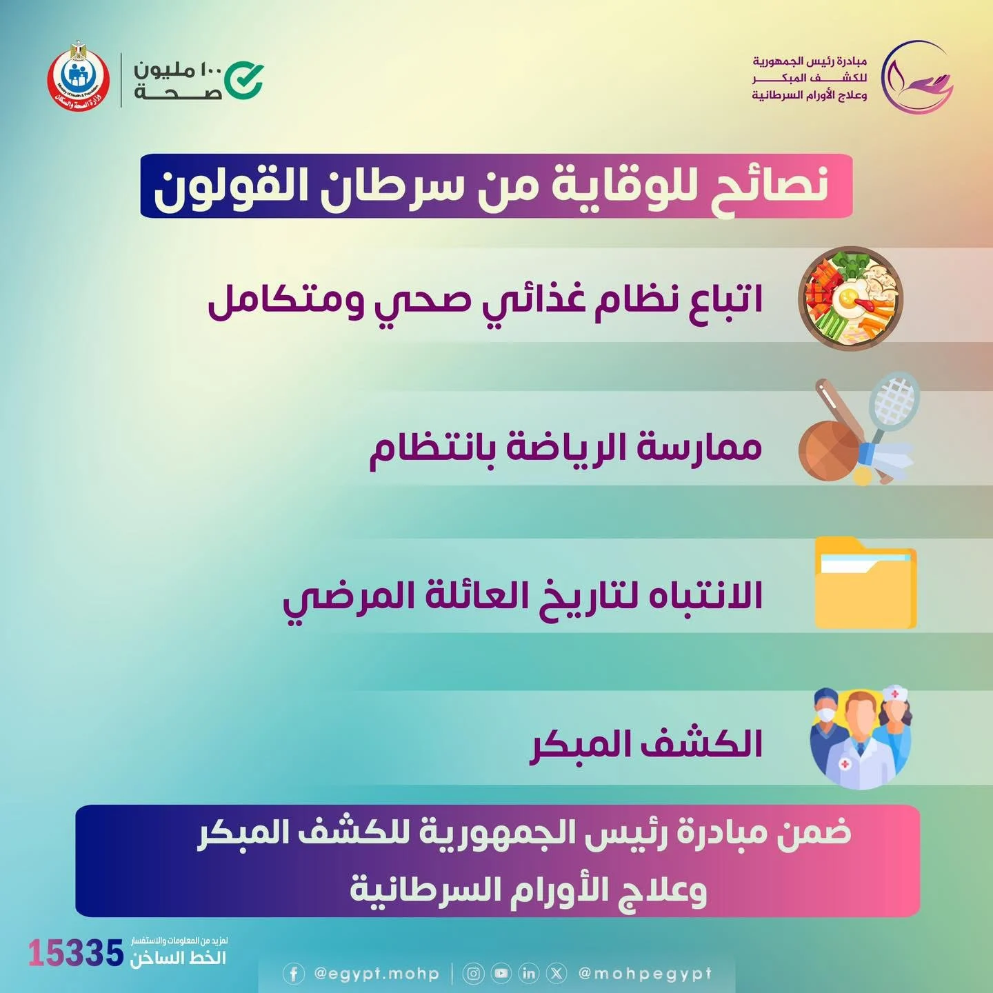 كشفت وزارة الصحة والسكان المصرية عن مجموعة من النصائح الهامة للوقاية من سرطان القولون والتى تشمل: