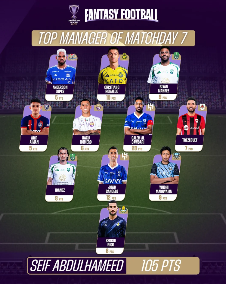 كما تواجد النجم السعودي سالم الدوسري (الهلال) كأفضل لاعب في الجولة برصيد 28 نقطة، إلى جانب البرتغالي كريستيانو رونالدو (النصر) بـ10 نقاط، والجزائري رياض محرز (الأهلي السعودي) بـ9 نقاط، بالإضافة إلى البرازيلي أندرسون لوبيز (يوكوهاما مارينوس) بـ5 نقاط.