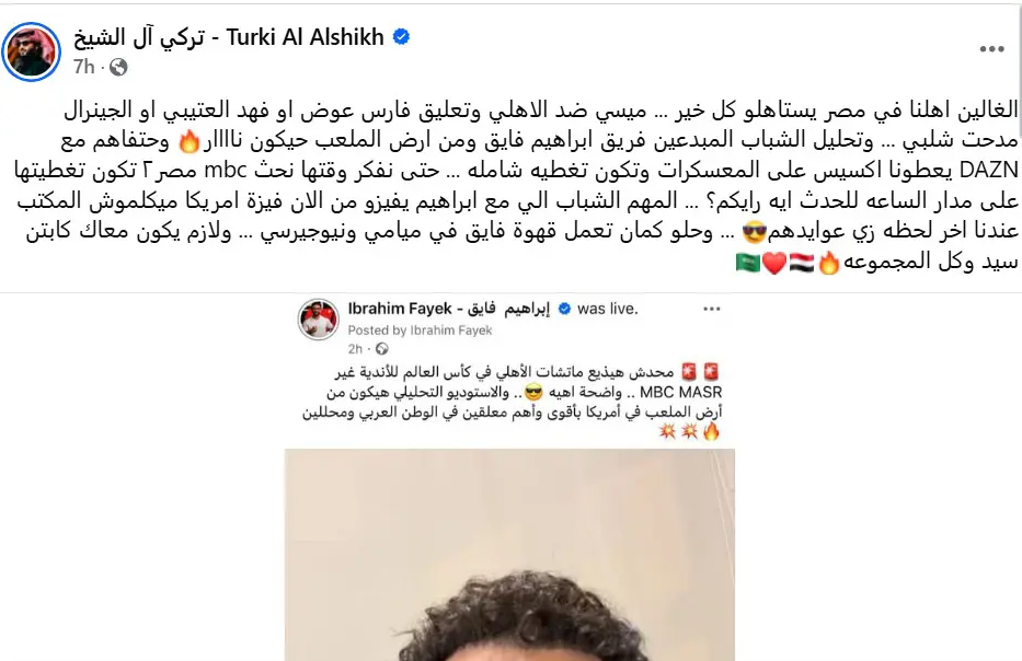 وقال آل الشيخ، عبر حسابه على فيسبوك: "الغاليين أهلنا في مصر يستاهلوا كل خير، ميسي ضد الأهلي بتعليق فارس عوض أو فهد العتيبي أو مدحت شلبي، وتحليل الشباب المبدعين من أرض الملعب، ونسعى للتفاهم مع منصة DAZN لمنحنا التصريح لتصوير المعسكرات لكي تكون تغطية شاملة".