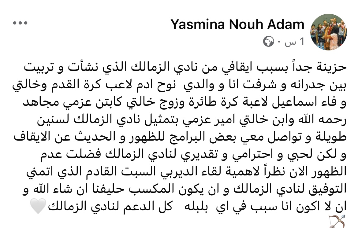 في أول تعليق لها، نشرت ياسمين نوح عبر حسابها على "فيسبوك" قائلة: "أشعر بحزن شديد بعد قرار إيقافي من نادي الزمالك، المكان الذي نشأت فيه وتربيت بين جدرانه، والذي مثله أفراد من عائلتي على مدار سنوات، بداية من والدي نوح آدم لاعب كرة القدم، وخالتي وفاء إسماعيل لاعبة الكرة الطائرة، وزوج خالتي الكابتن عزمي مجاهد رحمه الله، وابن خالتي أمير عزمي مجاهد".