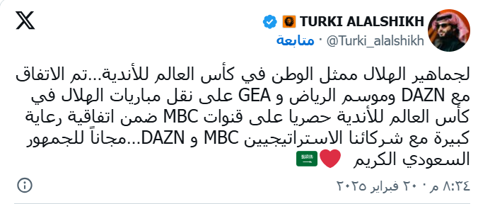زفّ تركي آل الشيخ، رئيس هيئة الترفيه في المملكة العربية السعودية، بشرى سارة لجماهير نادي الهلال السعودي، تتعلق بمشاركة الفريق في كأس العالم للأندية 2025.