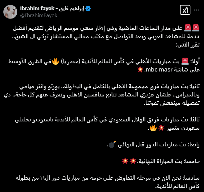 أعلن الإعلامي إبراهيم فايق حصول قنوات MBC على حقوق بث مباريات الأهلي المصري والهلال السعودي، بالإضافة لنصف نهائي ونهائي كأس العالم للأندية 2025 في الشرق الأوسط.
