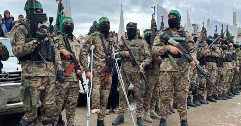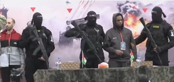 شارك مقاتل من قوات كتائب القسام، مبتور اليد والقدم ويرتدي زيا عسكريا ويحمل سلاحا، في مراسم الإفراج عن جنديين إسرائيليين برفح.