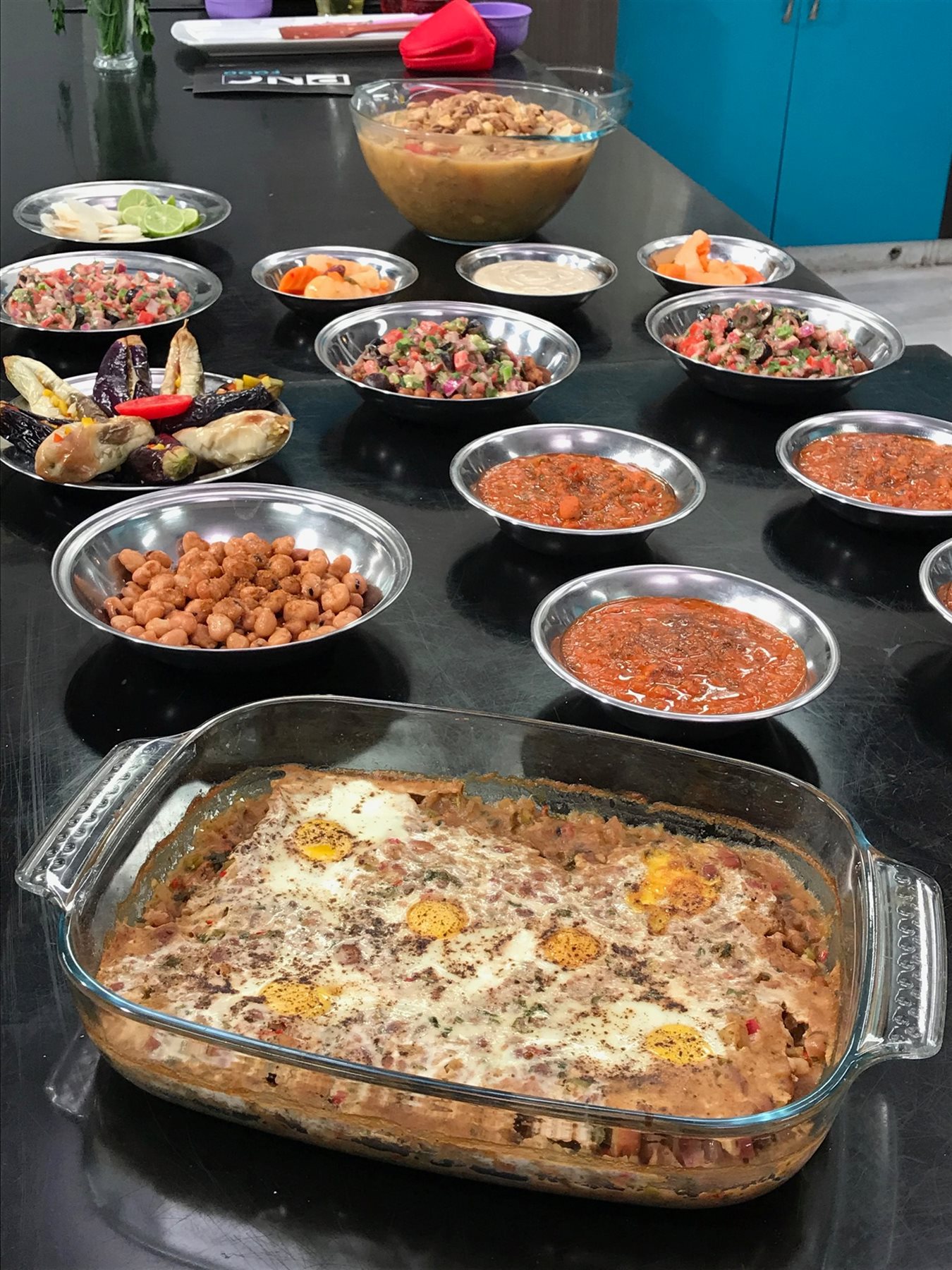 - يترك الفول ليسخن على النار، ثم تخلط كل الخضروات لعمل السلطة ويضاف لها الخل والليمون والطحينة والملح والفلفل الأسود.