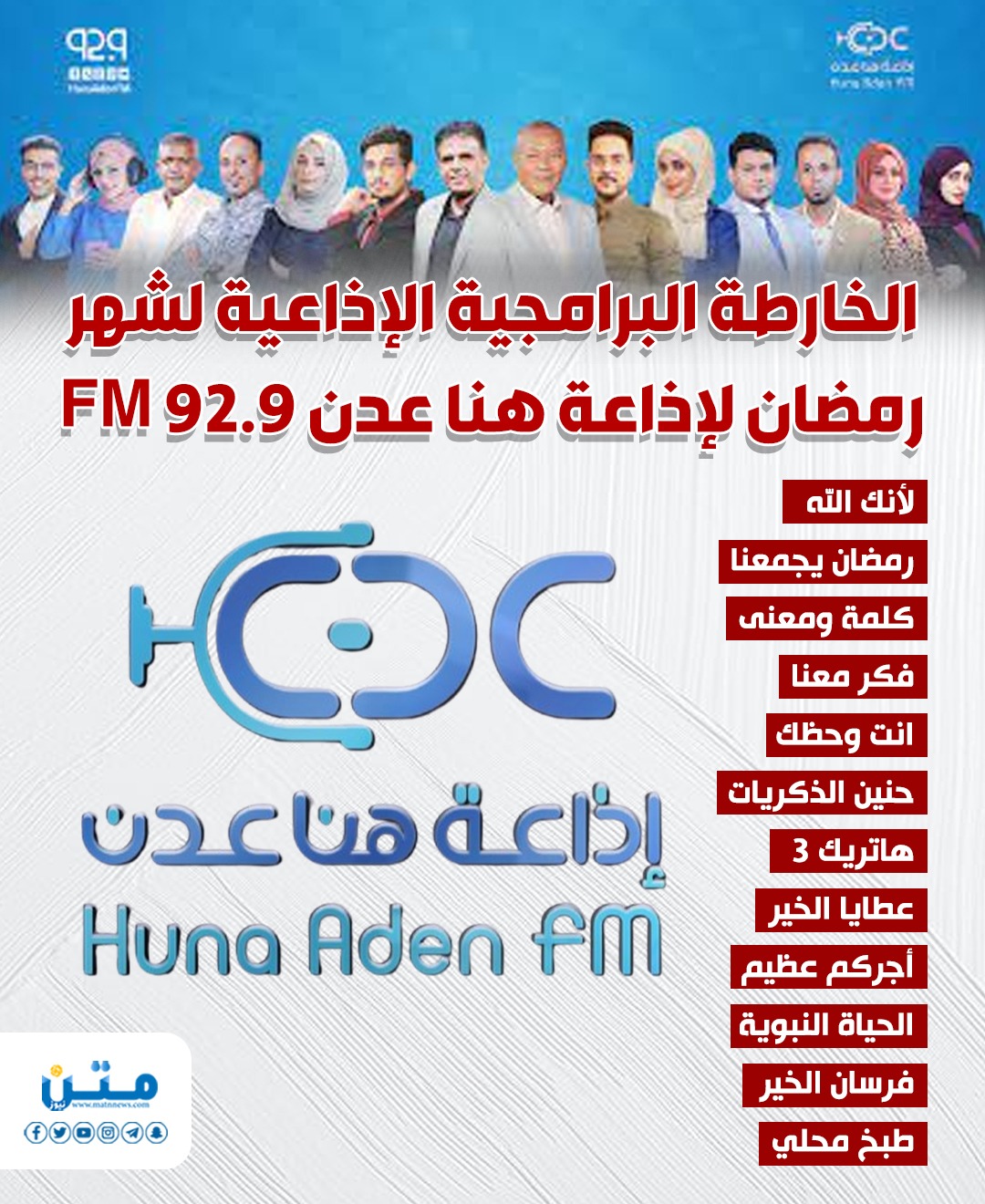 الخارطة البرامجية الإذاعية لشهر رمضان لإذاعة هنا عدن 92.9 FM (إنفوجراف) الأربعاء 26/فبراير/2025 - 11:16 م 2/26/2025 11:16:11 PM انفوجراف متن محمد حسن شارك طباعة - لأنك الله- رمضان يجمعنا- كلمة ومعنى - فكر معنا- انت وحظك- حنين الذكريات- هاتريك 3- عطايا الخير- أجركم عظيم- الحياة النبوية- فرسان الخير- طبخ محلي شارك الذكريات إنفوجراف عدن شهر رمضان رمضان ذكرى