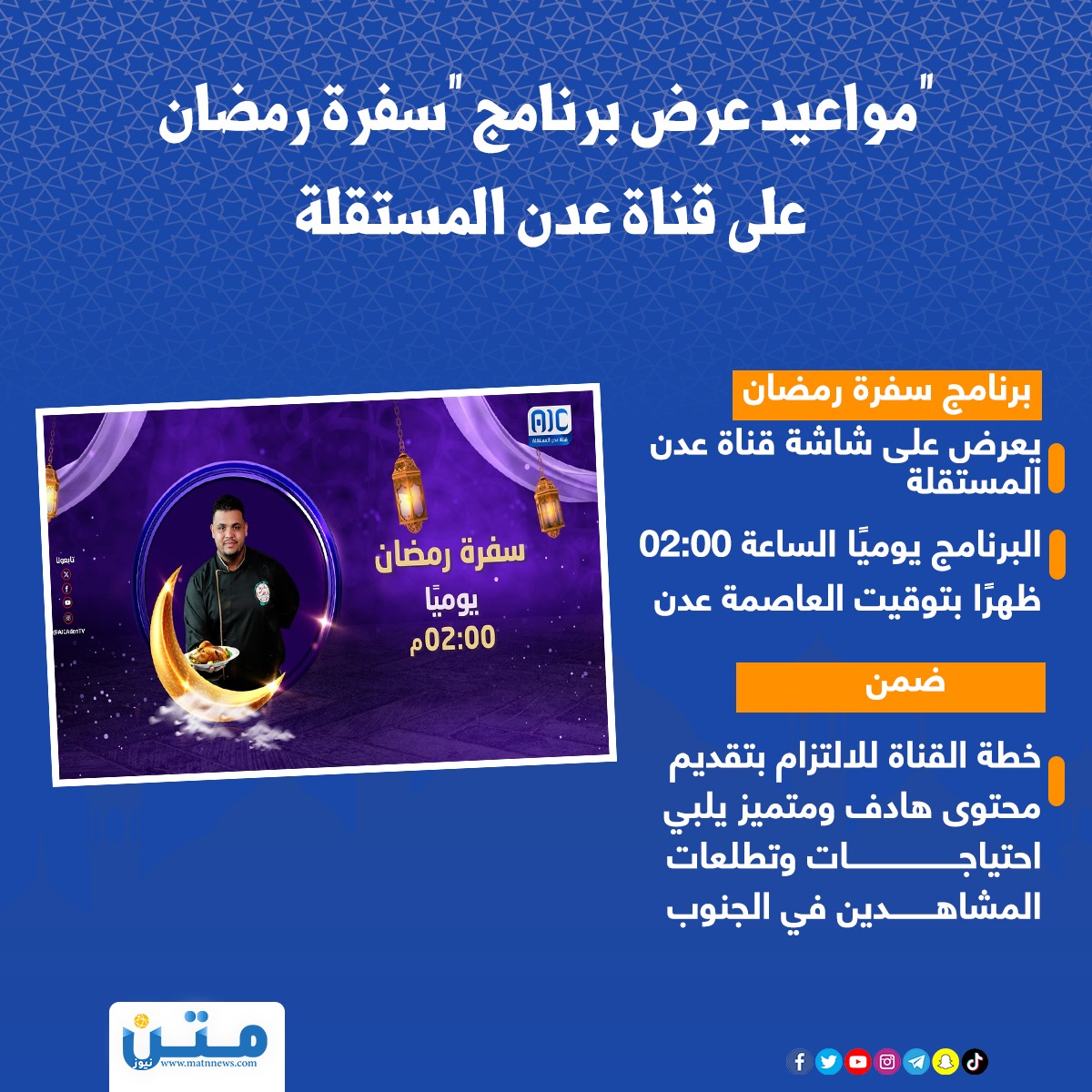 مواعيد عرض برنامج "سفرة رمضان" على قناة عدن المستقلة (انفوجراف)