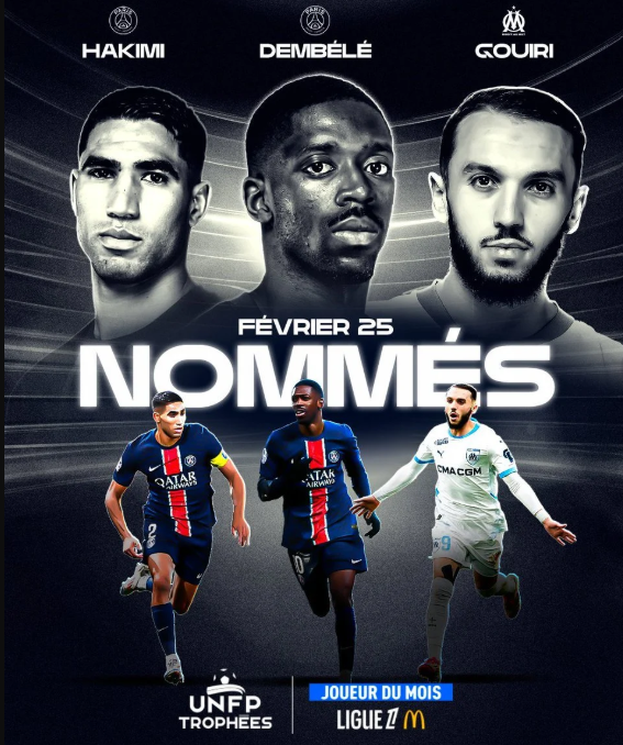 وكشفت رابطة المحترفين الفرنسية عن قائمة المرشحين للحصول على جائزة أفضل لاعب في فبراير بمسابقة الدوري الفرنسي، والتي يتصدرها ثنائي باريس سان جيرمان؛ أشرف حكيمي وعثمان ديمبيلي، ثم أمين جويري لاعب أولمبيك مارسيليا.