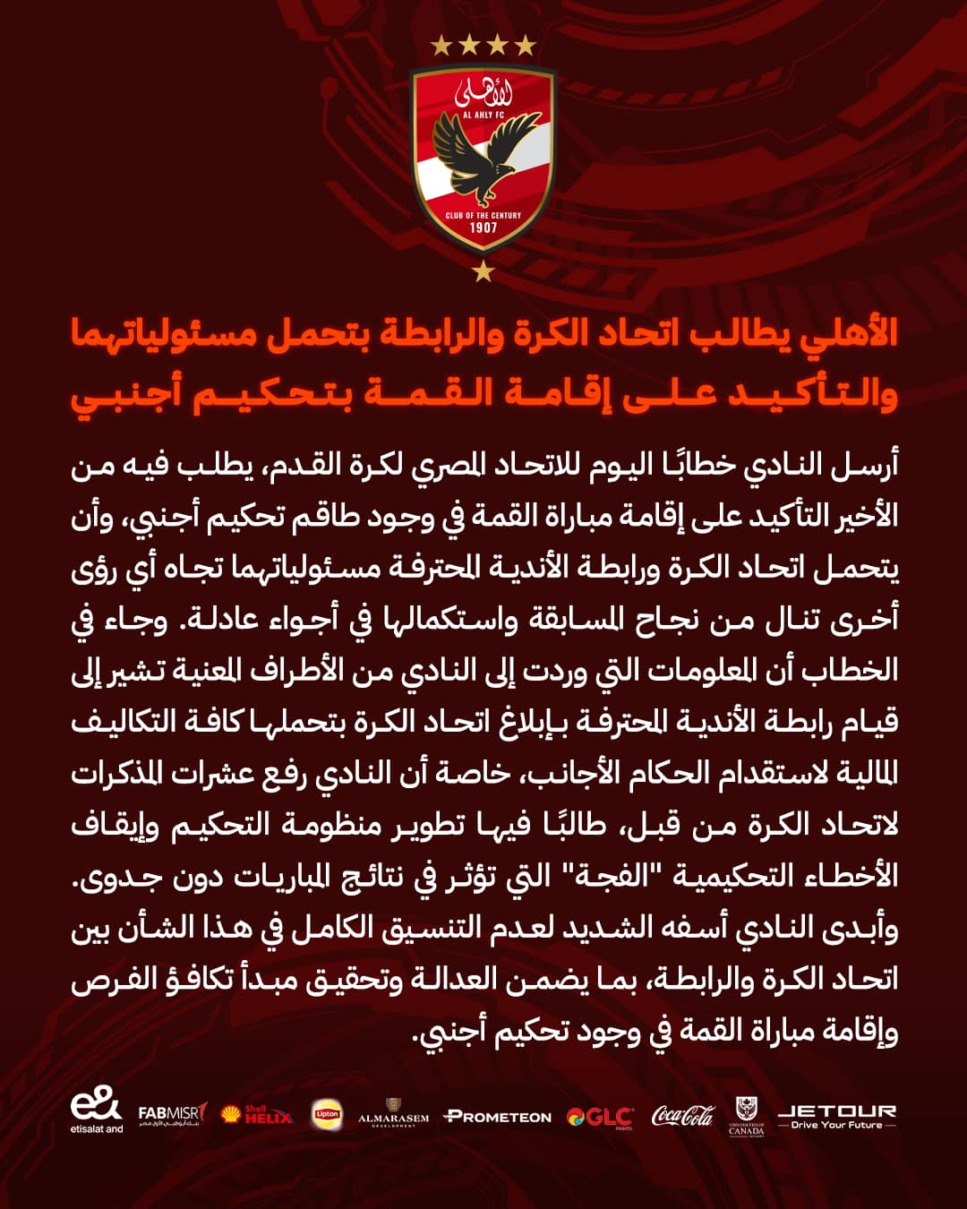 وأبدى النادي أسفه الشديد لعدم التنسيق الكامل في هذا الشأن بين اتحاد الكرة والرابطة، بما يضمن العدالة وتحقيق مبدأ تكافؤ الفرص وإقامة مباراة القمة في وجود تحكيم أجنبي.