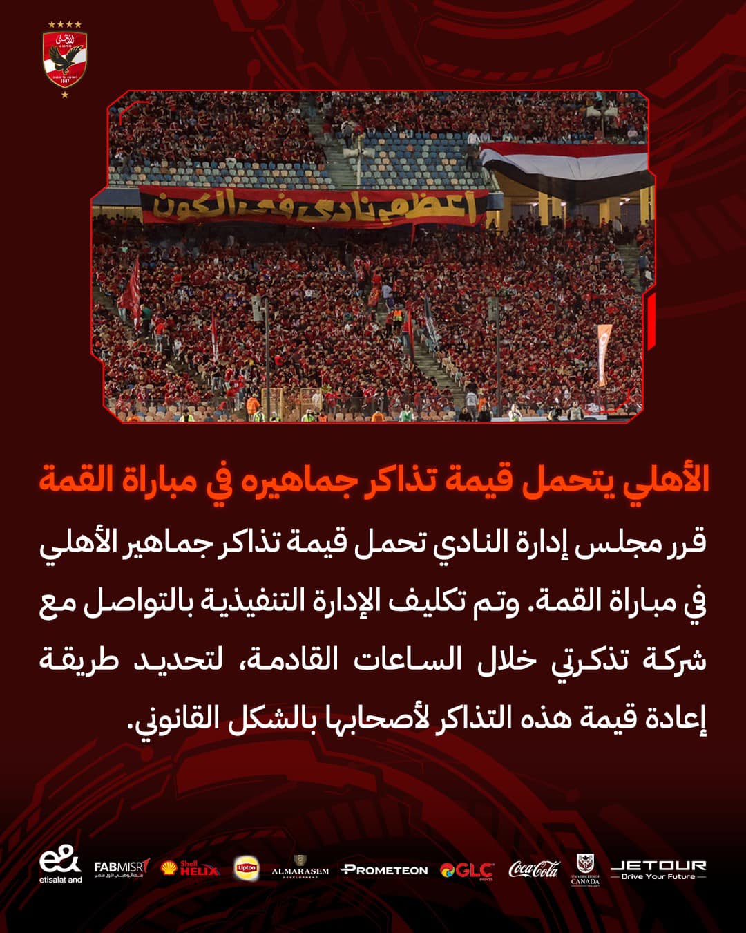 قرر مجلس إدارة النادي الأهلي تحمل قيمة تذاكر جماهير الفريق في مباراة القمة ضد غريمه الزمالك، والتي كان مُقررًا لها مساء اليوم الثلاثاء.