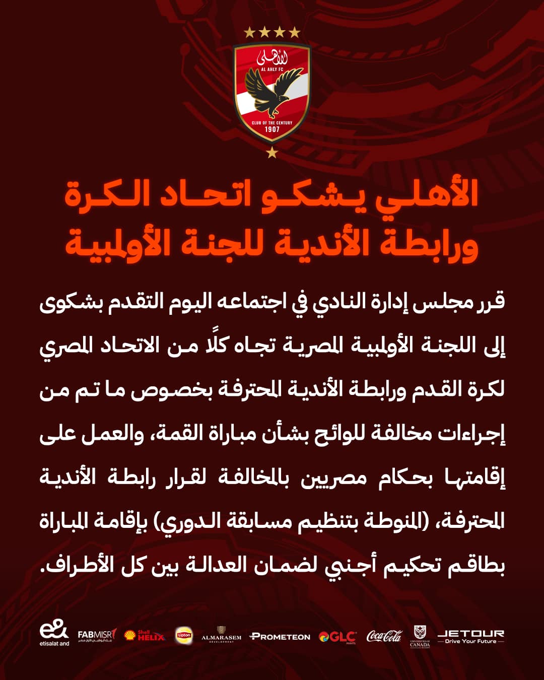 أعلن مجلس إدارة النادي الأهلي التقدم بشكوى إلى اللجنة الأولمبية المصرية تجاه كل من الاتحاد المصري لكرة القدم ورابطة الأندية المحترفة.