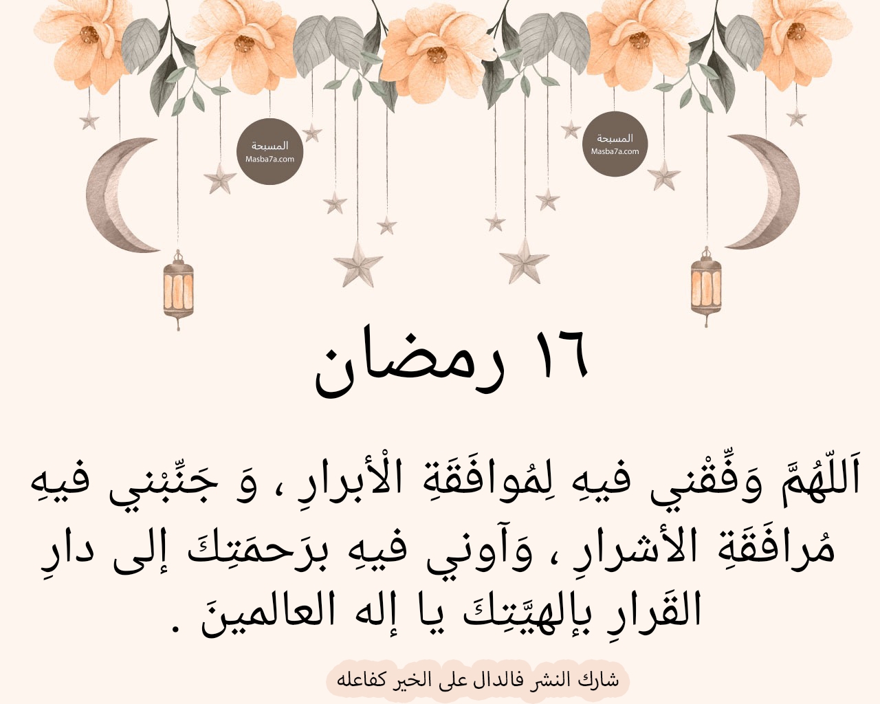 ويستحب للمسلم أن يكثر من الأدعية الجامعة في يوم 16 رمضان، ومن الأدعية التي يمكن ترديدها: