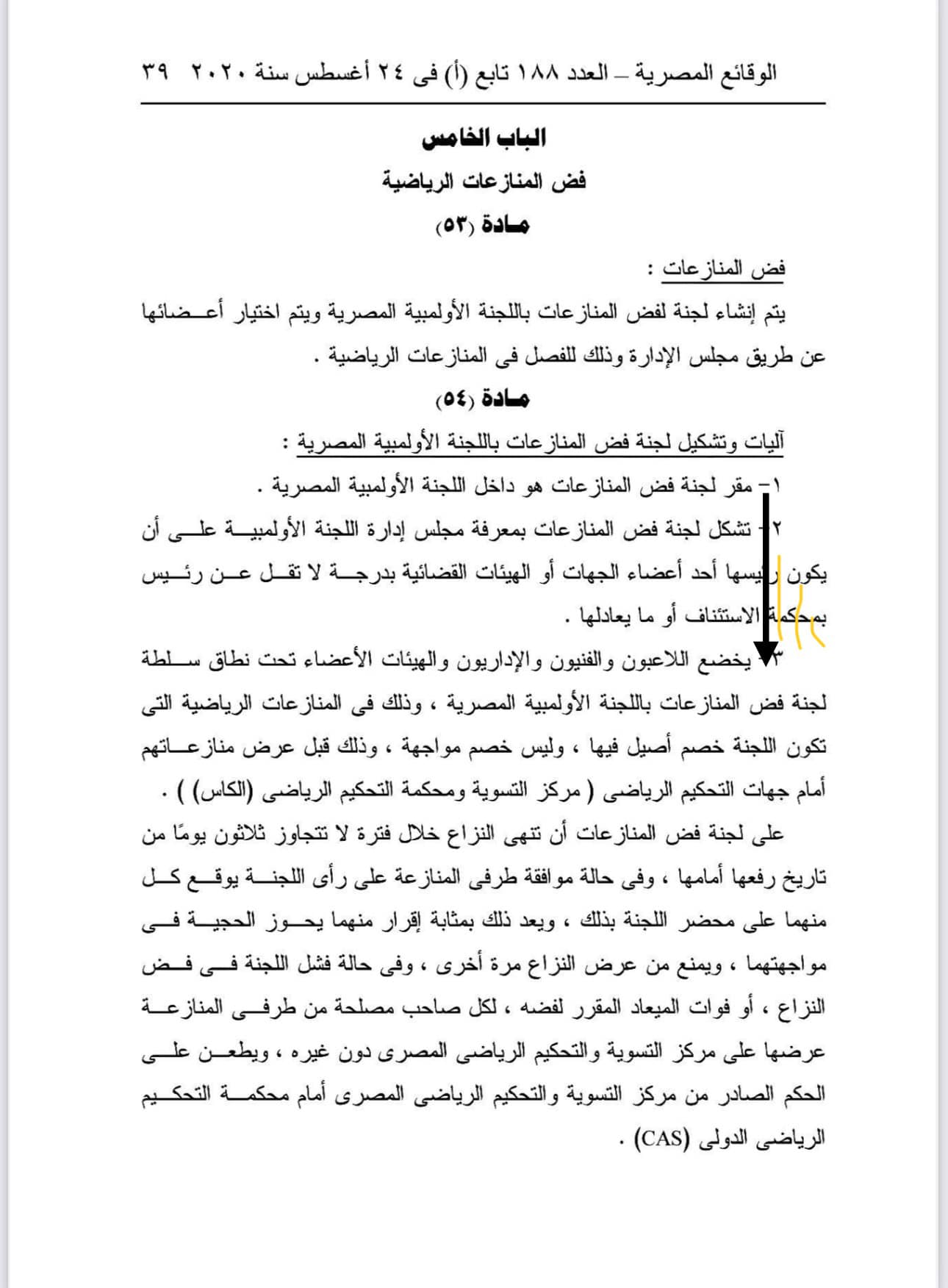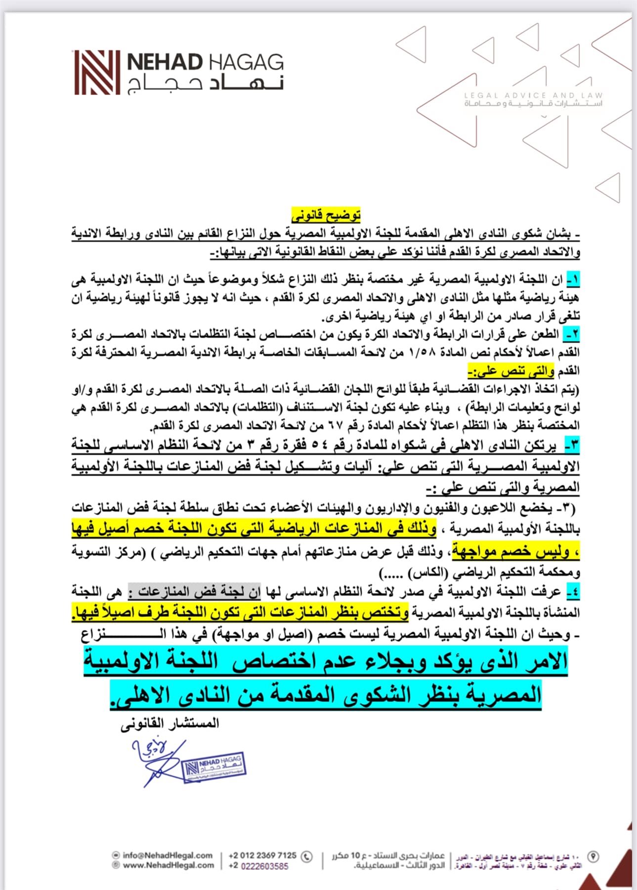 كما لفت إلى أن المادة 54/3 من لائحة اللجنة الأولمبية، التي يستند إليها الأهلي، تنظم عمل لجنة فض المنازعات داخل اللجنة الأولمبية، لكن اختصاصها يقتصر فقط على القضايا التي تكون اللجنة الأولمبية طرفًا أصيلًا فيها، وهو ما لا ينطبق على حالة الأهلي.