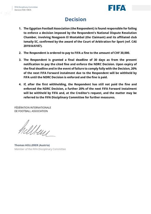 وكان فيفا قد قرر فرض غرامة مالية على الاتحاد المصري لكرة القدم قدرها 30 ألف فرنك سويسري، مع إمكانية فرض عقوبات إضافية في حال استمرار التأخير في تنفيذ القرار.