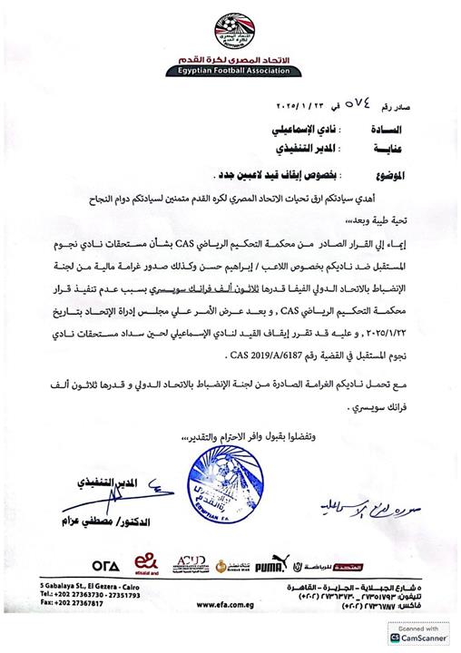 واستجابةً لهذا القرار، أعلن الاتحاد المصري لكرة القدم عن إيقاف قيد لاعبي الإسماعيلي حتى يتم سداد المستحقات المالية لنادي النجوم، وفقًا لحكم "كاس" الصادر في 21 فبراير 2020.