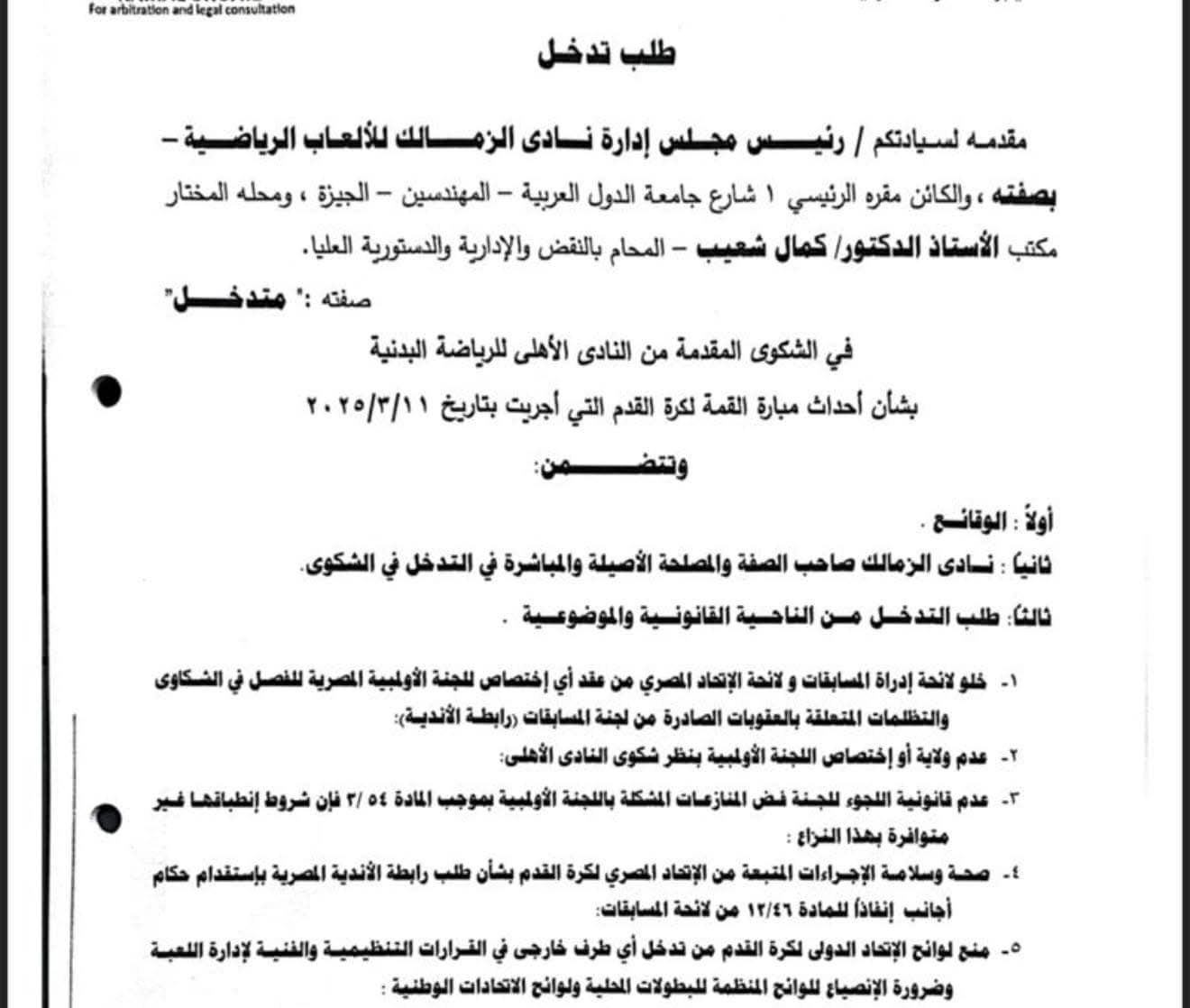 واستند الزمالك في طلبه إلى عدة أسباب قانونية وموضوعية، أبرزها: