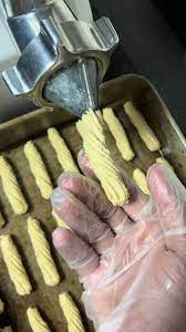 - ثم توضع العجينة داخل الماكينة، ثم تُضغط لتخرج أشكال متناسقة تُرص في صينية مدهونة خفيفًا أو مفروشة بورق زبدة.