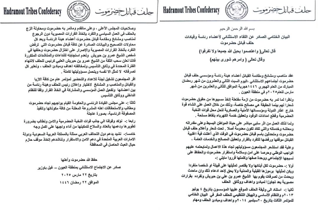 ثانيا: استناد إلى وثيقة الحلف الموقع عليها المؤسسون بتاريخ 1 يوليو ۲۰۱۳ م والنظام الأساسي والهيكل التنظيمي للحلف المقر في البيان الختامي للمؤتمر الثالث بتاريخ ٢٠ سبتمبر ۲۰۱٤ م واهداف ومبادئ الحلف ومهام وصلاحيات المجلس الأعلى، وعلى ما تقدم وماتمر به حضرموت ومحاولة الزج بالحلف في العمل السياسي والتفرد باتخاذ القرارات المصيرية دون الرجوع المناصب ومشائخ ومقادمة قبائل حضرموت أعضاء هيئة الرئاسة وبعد كل محاولات التصحيح والبيانات الصادرة عن كافة قبائل حضرموت التي ترفض التفرد باتخاذ القرارات المصيرية والإصرار على اختزال حضرموت وحلفها في شخص الشيخ عمرو بن حبريش ولعدم استجابته للنداءات والمناشدات المتكررة فاننا نعلن سحب الثقة من الشيخ عمرو بن حبريش العليي كرئيس للحلف لانتهاء الفترة المحددة في وثائق التأسيس ولمخالفته اهداف ومبادئ الحلف، ونعتبر كل تصرفاته لا تمثل الا نفسه ويتحمل مسؤوليتها كاملة.