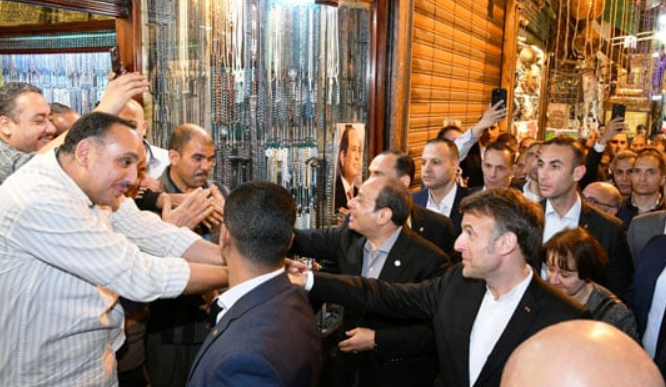 التف المواطنون فى منطقة خان الخليلى بالقاهرة حول السيد الرئيس عبد الفتاح السيسى ونظيره الفرنسى إيمانويل ماكرون، حيث عبروا عن ترحيبهم بالرئيس السيسى وضيفه الكبير.