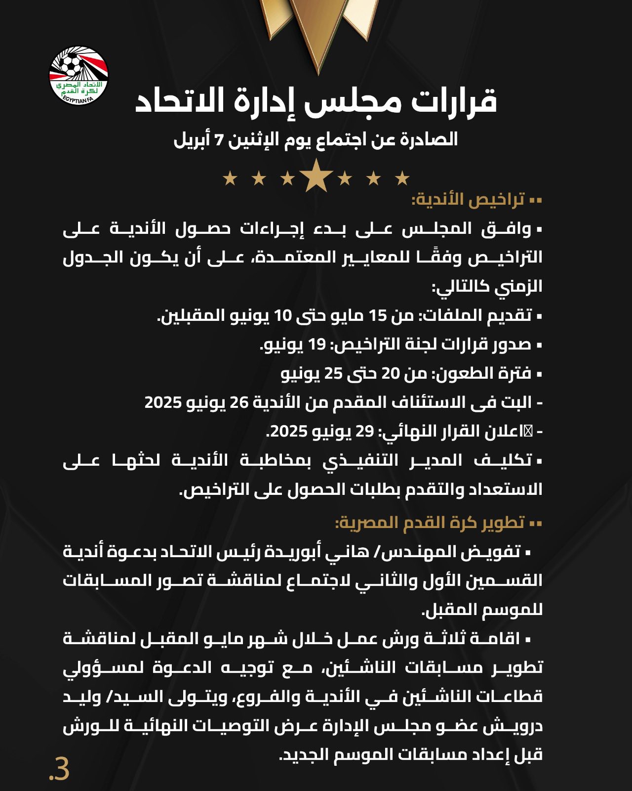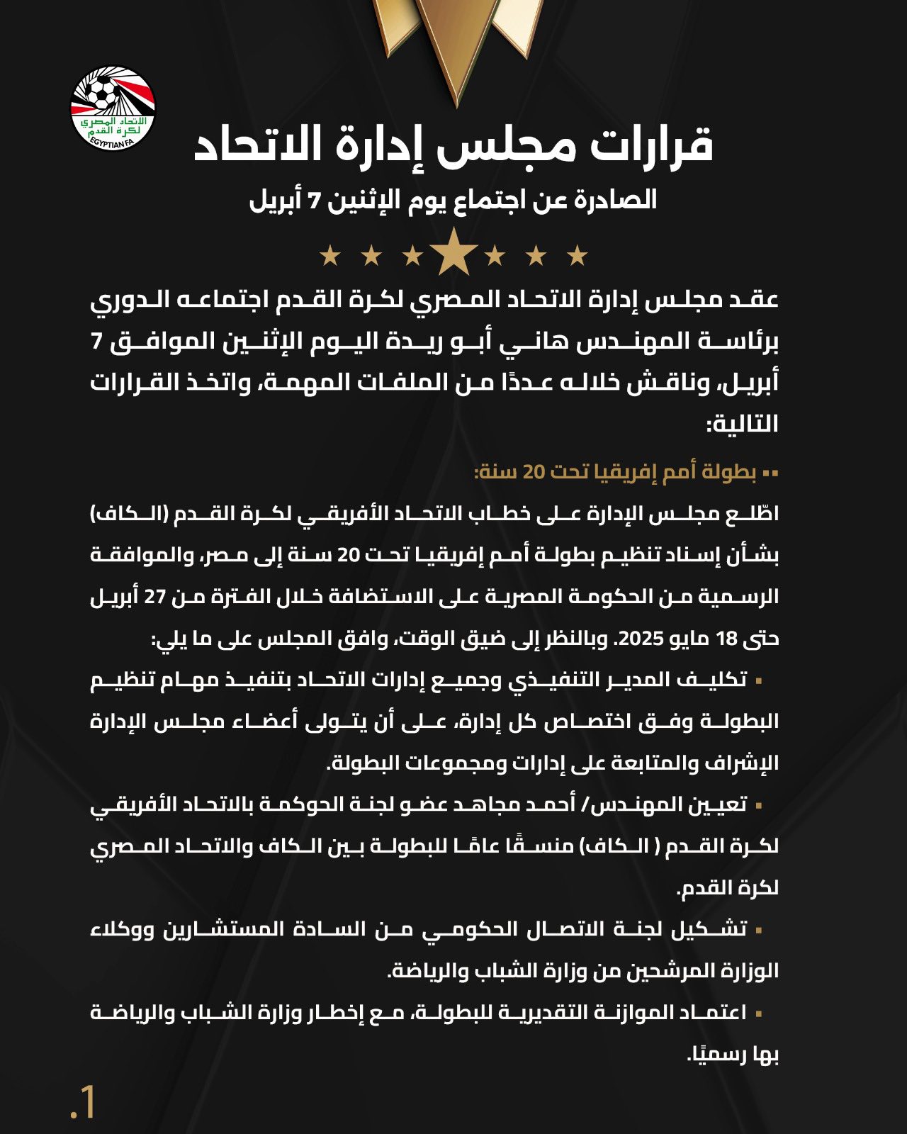 وأسفر اجتماع الاتحاد المصري عن عدد من القرارات على النحو التالي: