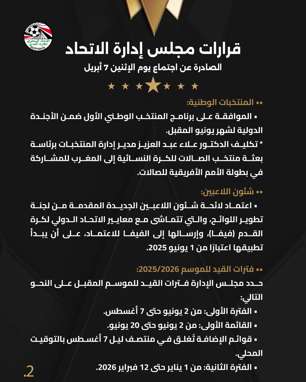 اعتماد لائحة شئون اللاعبين الجديدة المقدمة من لجنة تطوير اللوائح، بما يتوافق مع معايير الاتحاد الدولي لكرة القدم (فيفا)، تمهيدًا لإرسالها للفيفا لاعتمادها. ويبدأ تطبيقها رسميًا اعتبارًا من 1 يونيو 2025.