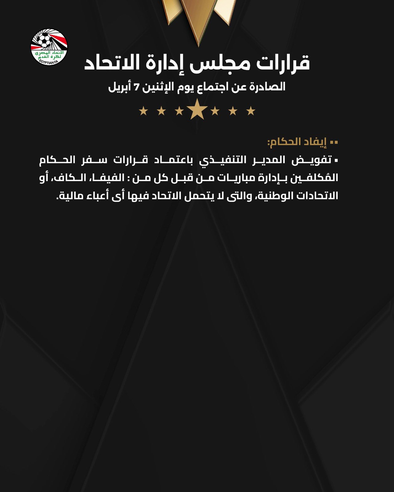 تفويض المدير التنفيذي باعتماد سفر الحكام المكلّفين بإدارة مباريات من قبل الفيفا أو الكاف أو الاتحادات الوطنية الأخرى، بشرط عدم تحمل الاتحاد المصري أي أعباء مالية في هذا الشأن.