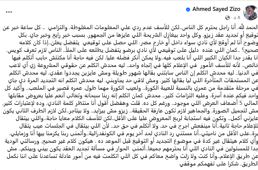 والجماهير لازم تكون عارفة الحقيقة.. زيزو مش بيزايد.. ولا بيتاجر.. لكن لازم الطرف الثاني يكون عايزني أكمل.. وتكون فيه استجابة لحاجه من المعروض عليا على الأقل.. لكن للأسف الكلام معايا حاجة.. واللي بيتقال للإعلام حاجة تانية.. أنا مينفعش اجرح في حد ولا أتكلم في حق حد.. لأن اللي بيتقال في الجلسات عيب يتقال برة.. على الأقل من ناحيتي.. أنا مستني رد النادي لحد آخر يوم في الكونفدرالية.. وأتمنى ربنا يكرمنا بيها أنا وزمايلي. وأي كلام هيتقال غير كدة في موضوع التجديد أو التوقيع قبل الموعد ده. هيكون كلام غير صحيح. ورسالتي الودية جدا للمسئولين في النادي اللي أنا بحترمهم جميعا.. أتمنى الحوار في مسألة تجديد العقد يكون بيني وبينكم.. مش عن طريق الإعلام.. وأنا كنت ولا زلت واضح معاكم في كل اللي اتكلمت فيه من أمور عادلة تساعدنا على اننا نكمل الطريق. شكرا على تفهمكم موقفي ".