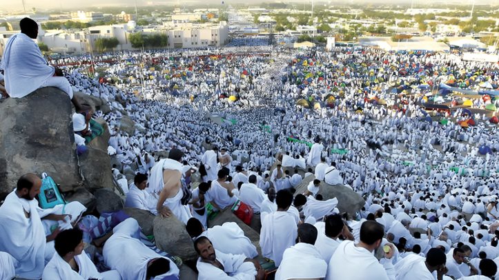 ويتوجه الحجاج من منى إلى جبل عرفات، حيث يقفون منذ الزوال حتى غروب الشمس، ويكثرون فيه من الدعاء والتضرع، ثم يتوجّهون بعد غروب الشمس إلى مزدلفة لجمع المغرب والعشاء والمبيت.