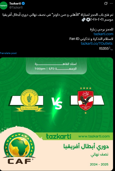 أعلنت شركة تذكرتي طرح تذاكر مباراة الأهلي المصري وصن داونز الجنوب إفريقي، في إياب نصف نهائي دوري أبطال إفريقيا لموسم 2025.