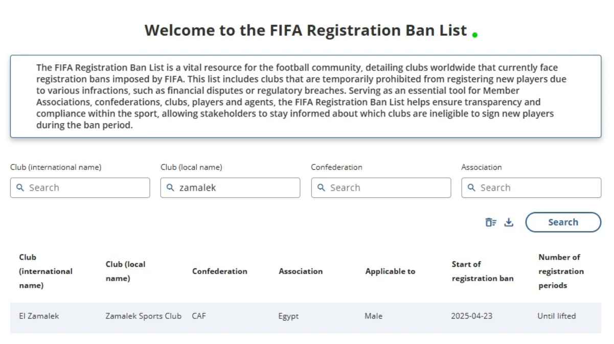 أعلنت بوابة إيقاف القيد الخاصة بالاتحاد الدولي لكرة القدم "فيفا"، مساء اليوم الأربعاء، عن إيقاف قيد جديد لنادي الزمالك المصري.