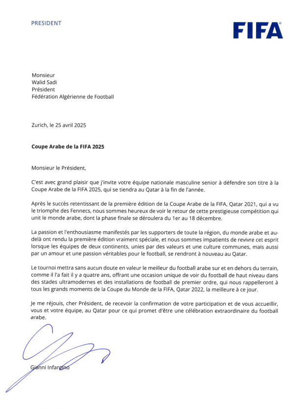 بخطاب رسمي.. الفيفا يدعو منتخب الجزائر للمشاركة في كأس العرب 2025