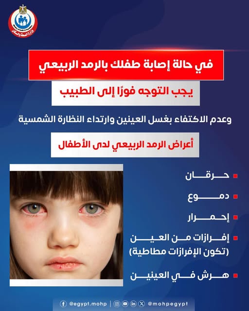 ونشرت الوزارة عبر صفحاتها الرسمية على مواقع التواصل الاجتماعي منشورًا توعويًا يوضح أعراض الرمد الربيعي لدى الأطفال، مشددة على ضرورة التوجه الفوري إلى الطبيب المختص فور ملاحظة الأعراض، وعدم الاكتفاء بغسل العينين أو ارتداء النظارات الشمسية فقط.