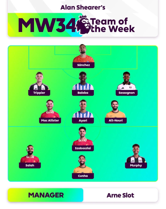 أعلنت رابطة الدوري الإنجليزي الممتاز، التشكيلة المثالية للجولة الـ34 من البريمرليج، والتي شهدت حسم ليفربول للقب بشكل رسمي.