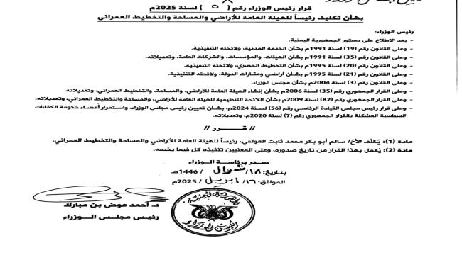 أصدرت رئاسة الوزراء باليمن القرار رقم 5 لسنة 2025م بشأن تكليف رئيسًا للهيئة العامة للأراضي وعقارات الدولة.
