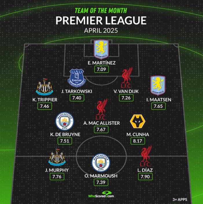 وبحسب موقع "هوسكورد" العالمي، المتخصص في إحصائيات كرة القدم، شهدت التشكيلة المثالية لشهر أبريل في مسابقة الدوري الإنجليزي الممتاز "البريميرليج"، تواجد عمر مرموش وكيفين دي بروين ثنائي مانشستر سيتي، وفيرجيل فان دايك ومالك أليستر ولويس دياز ثلاثي ليفربول، بينما شهدت غياب النجم المصري محمد صلاح.