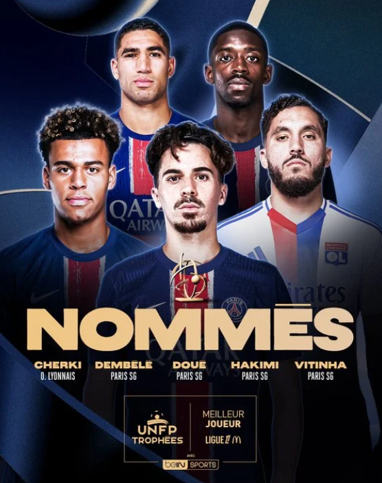 جائزة أفضل لاعب في الدوري الفرنسي، تواجد كل من أشرف حكيمي، عثمان ديمبيلي، جواو فيتينا ودوي من باريس سان جيرمان، بالإضافة إلى ريان شرقي لاعب ليون.