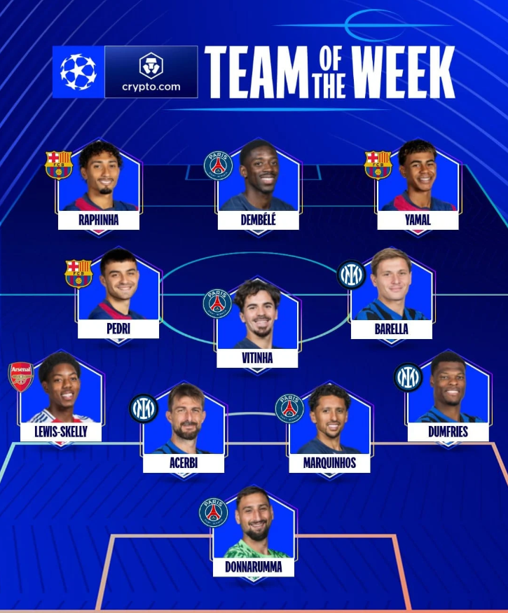 خط الهجوم: رافينيا (برشلونة)، عثمان ديمبيلي (باريس سان جيرمان)، لامين يامال (برشلونة).