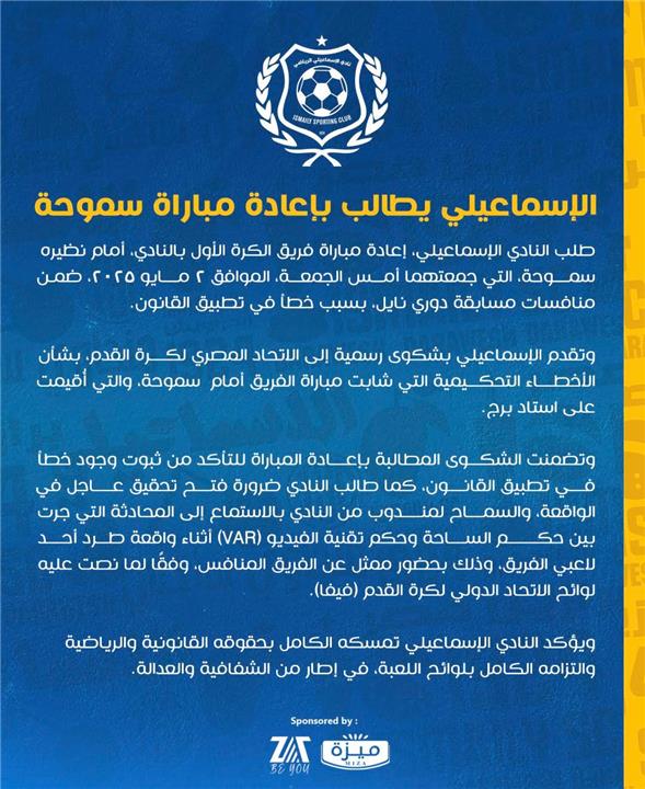 ويؤكد النادي الإسماعيلي تمسكه الكامل بحقوقه القانونية والرياضية والتزامه الكامل بلوائح اللعبة.