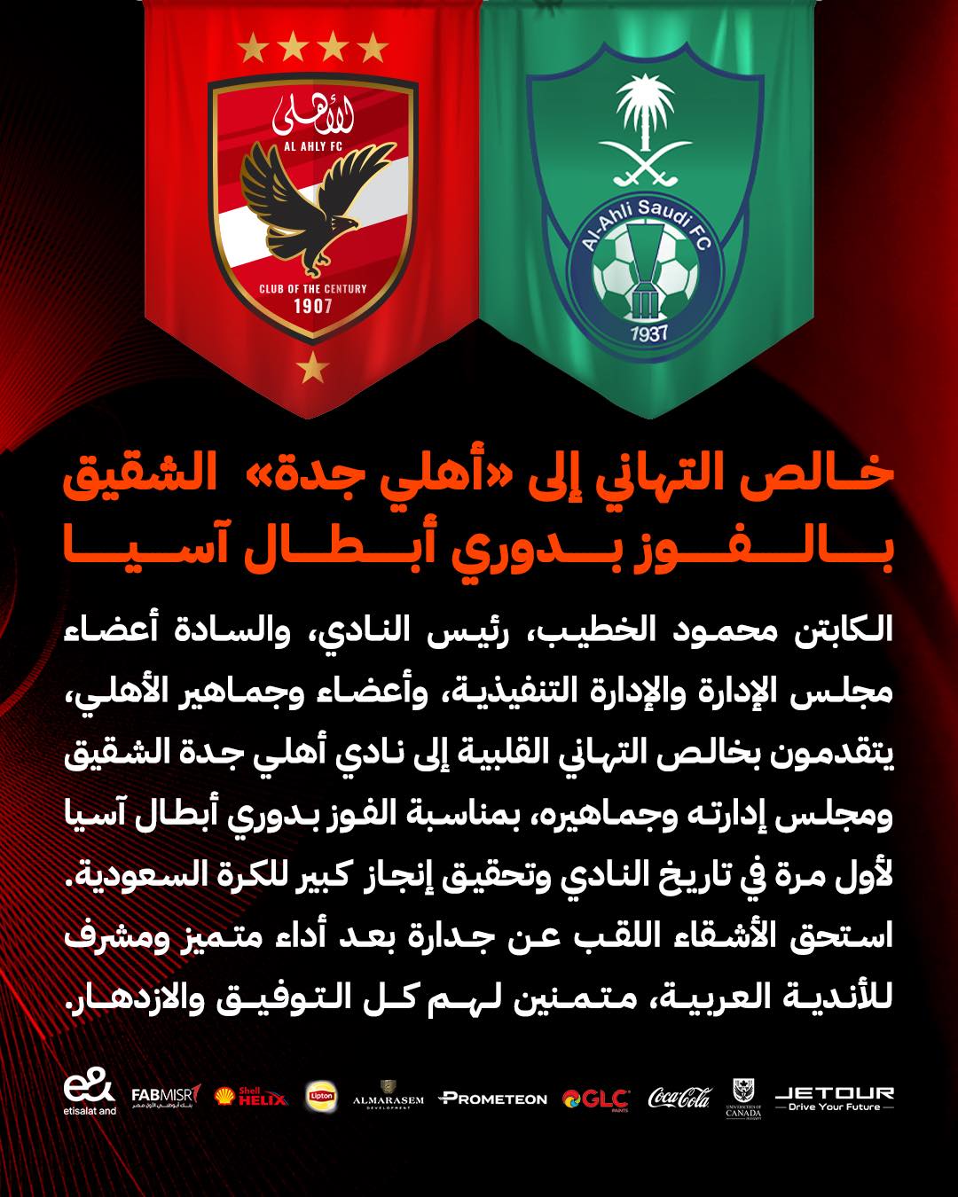 وأضاف النادي الأهلي في بيانه الرسمي::الكابتن محمود الخطيب رئيس النادي، وأعضاء مجلس الإدارة والإدارة التنفيذية، وأعضاء وجماهير الأهلي، يتقدمون بخالص التهاني القلبية إلى نادي أهلي جدة الشقيق ومجلس إدارته وجماهيره، بمناسبة الفوز بدوري أبطال آسيا لأول مرة في تاريخ النادي وتحقيق إنجاز كبير للكرة السعودية".